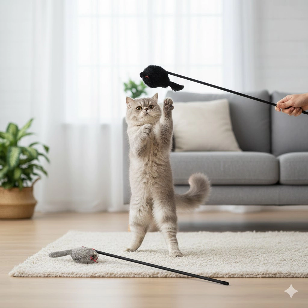 -Interação e estímulo: promove caça simulada, reduz ansiedade e tédio, melhora o bem-estar do gato.